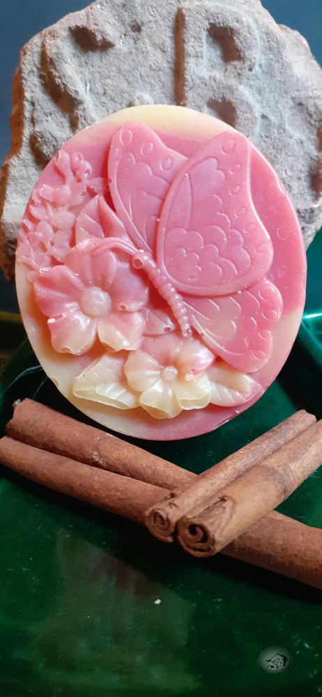 Ingredients: coconut oil, olive oil, animal fat, 100% natural ylang ylang-cinnamon-patchouli essential oils, mica (mineral coloring) starch, sodium hydroxide, distilled water, sodium lactate, glycerin*